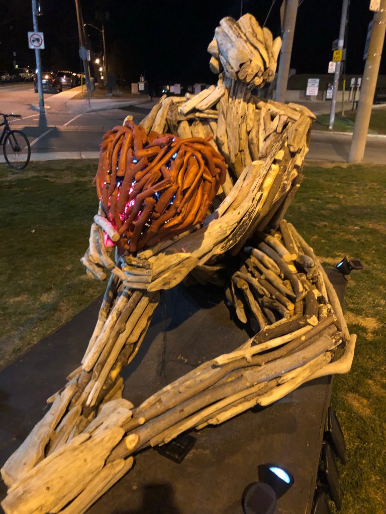 With the recent shut downs in Ontario, it’s made it a bit harder to see the light at the end of the tunnel. Luminosity’s final weekend gives us a small glimpse. Closing this Sunday, April 11, the 8 installations brighten Queen Street East from Eastern Avenue to Victoria Park. Ranging from a joyful piano to a warmly beating heart, a pop art collection of cakes to a drift wood loving figure, this series is as diverse as it is compelling. Enjoy a short preview below – but none of these photos can do justice to a late night local adventure in person. We miss city life, too. But, thanks to the Beaches BIA, Luminosity gave us a glimpse and a glimmer into what we know is waiting on the other side.